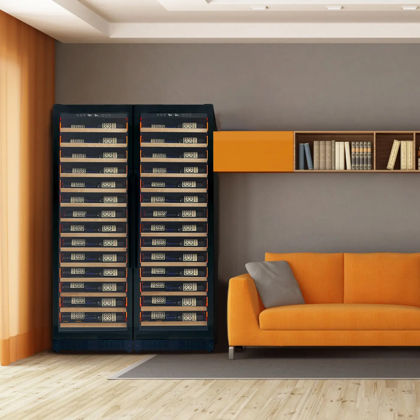 Reserva Series 134 Bottle 71" Tall Four Zone Black Side-by-Side Shallow Wine Refrigerator with Wood Front Shelves