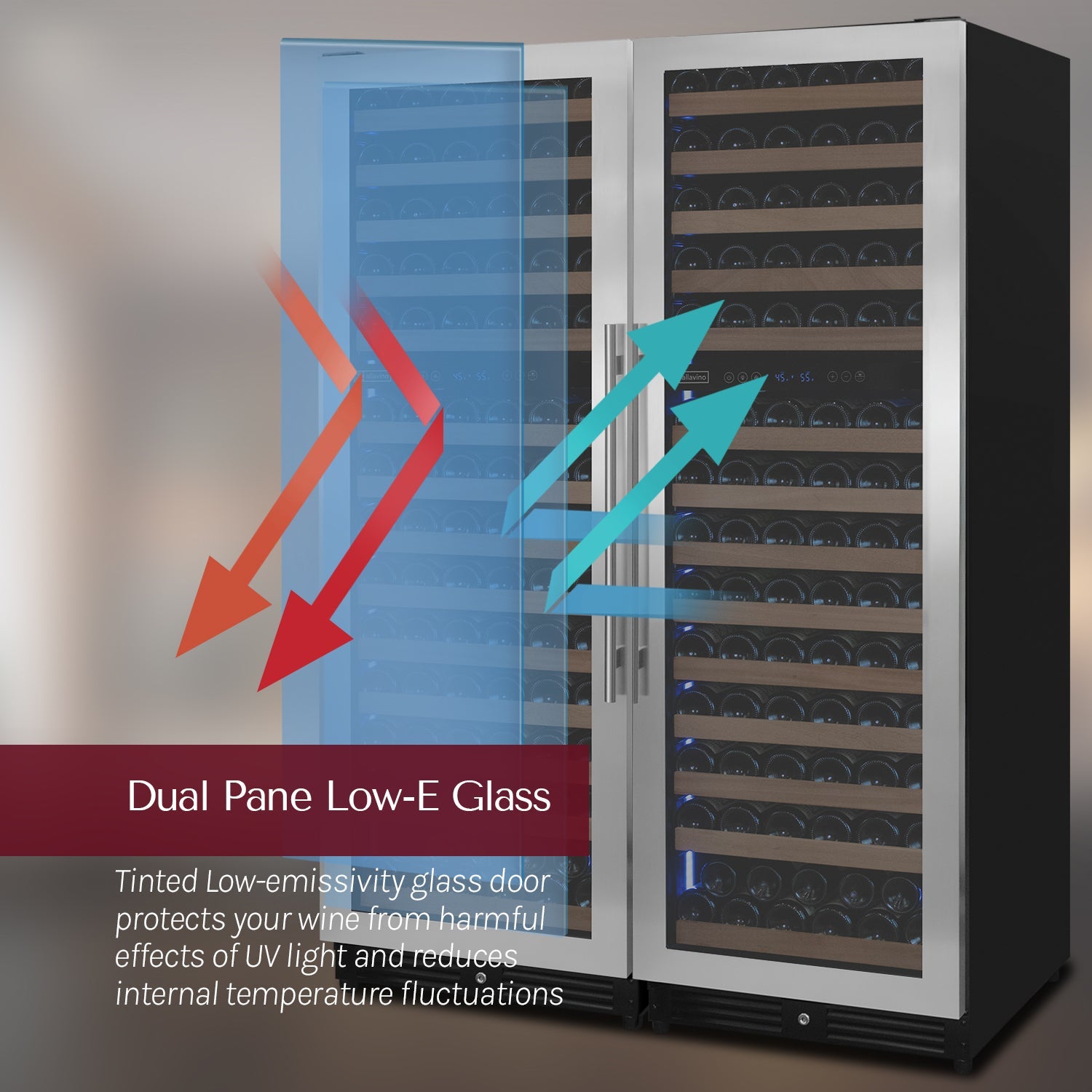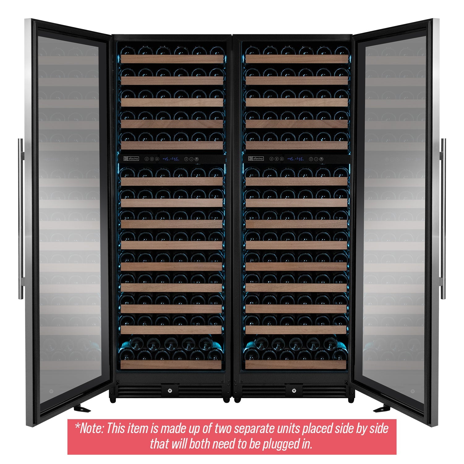 Allavino's 2X-VSW15471D-2S Reserva Series 308 Bottle 71" Tall Four Zone Stainless Steel Side-by-Side Wine Refrigerator with Tru-Vino Temperature Control Technology is made up of two separate dual zone wine refrigerators placed side by side. The wine storage racks feature wood slats that cradle your bottles for added protection. The seamless stainless steel doors showcase an elegant and clean profile while also resisting visible fingerprints, and the tinted LowE glass protects your wine from the harmful effects of UV light. The customizable LED lighting allows you to choose from 9 color options and 5 brightness levels. Unlike incandescent lighting, LED lighting does not give off heat that can damage your wine. Two digital control panels allow you to precisely set the temperature in each zone independently, between 41-64 degrees Fahrenheit. Energy efficient Tru-Vino Cooling Technology delivers precise temperature control with low vibrations and ultra-quiet operation. Allavino's trademarked FlexCount shelving design provides the ultimate flexibility in storage options while maximizing capacity. It gives you flexible storage options for a diverse collection of up to 308 wine bottles.
