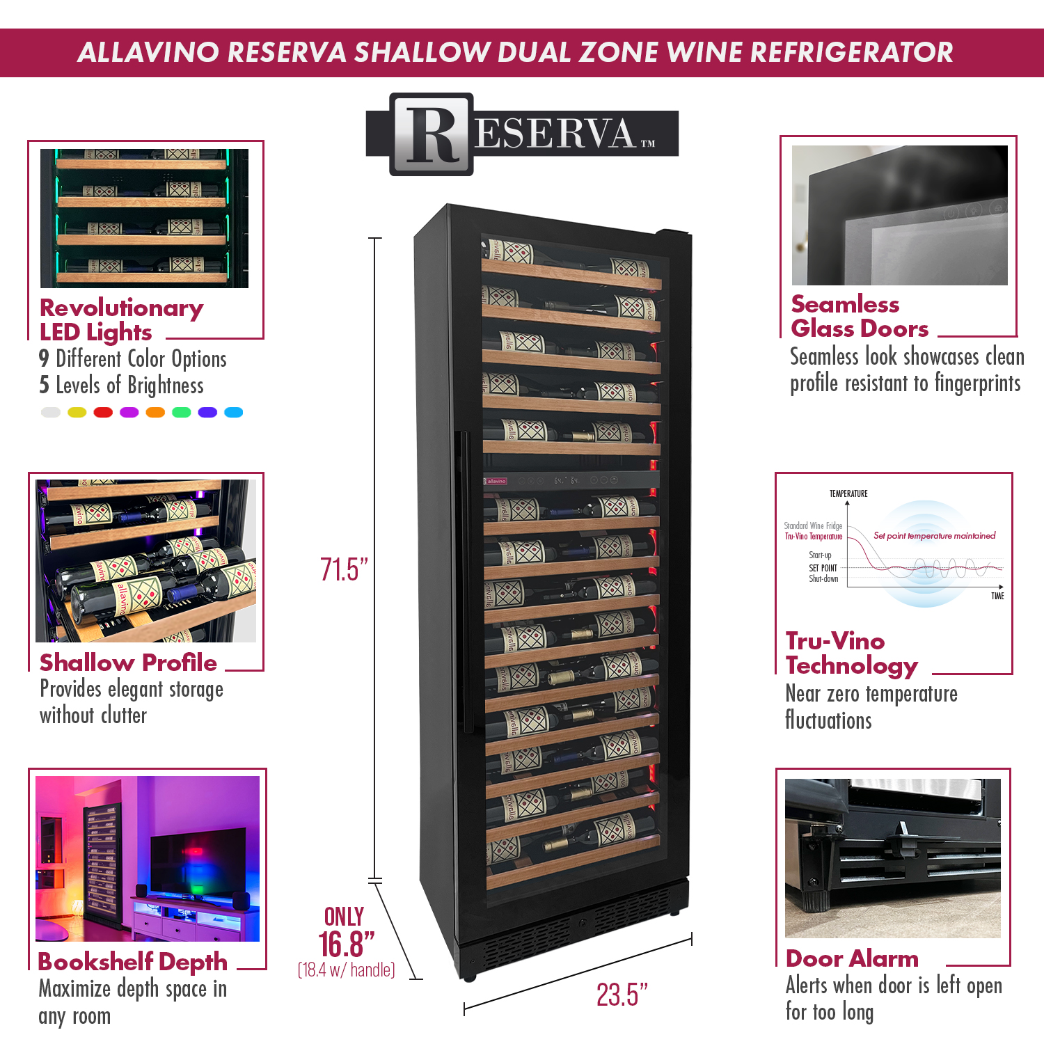 Reserva Series 67 Bottle 71" Tall Dual Zone Right Hinge Black Shallow Wine Refrigerator with Wood Shelf Fronts