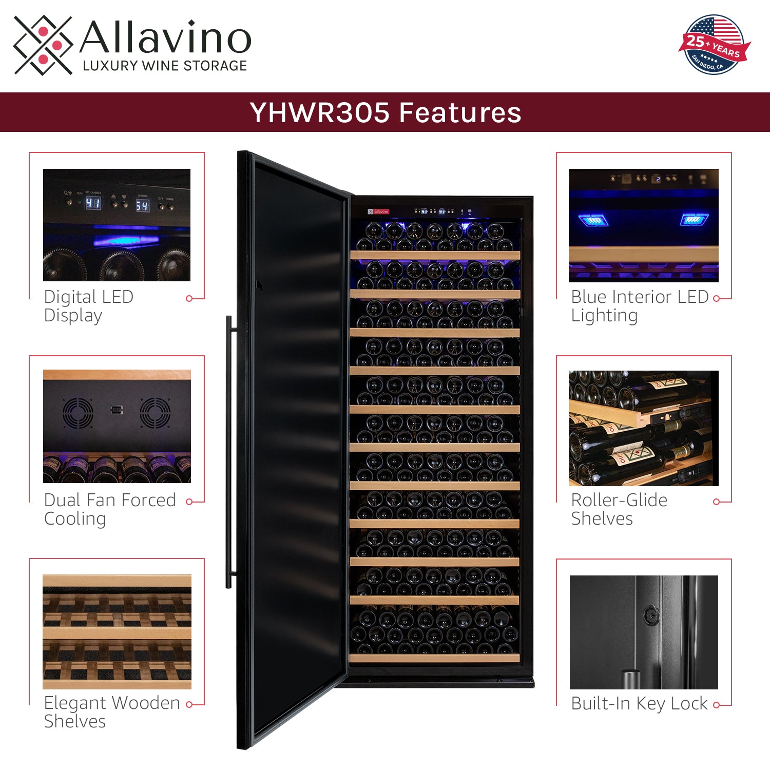 Each of the 10 extra thick hardwood shelves can support the weight of up to 28 regular size bottles with standard spacing, and the bottom shelf can hold larger magnum bottles or up to 25 standard bottles, for a maximum capacity of 305 bottles. The shelves glide-out on ball-bearing tracks that allow you to reach every bottle in your collection with ease. *Storage of larger diameter bottles will affect your overall bottle capacity.