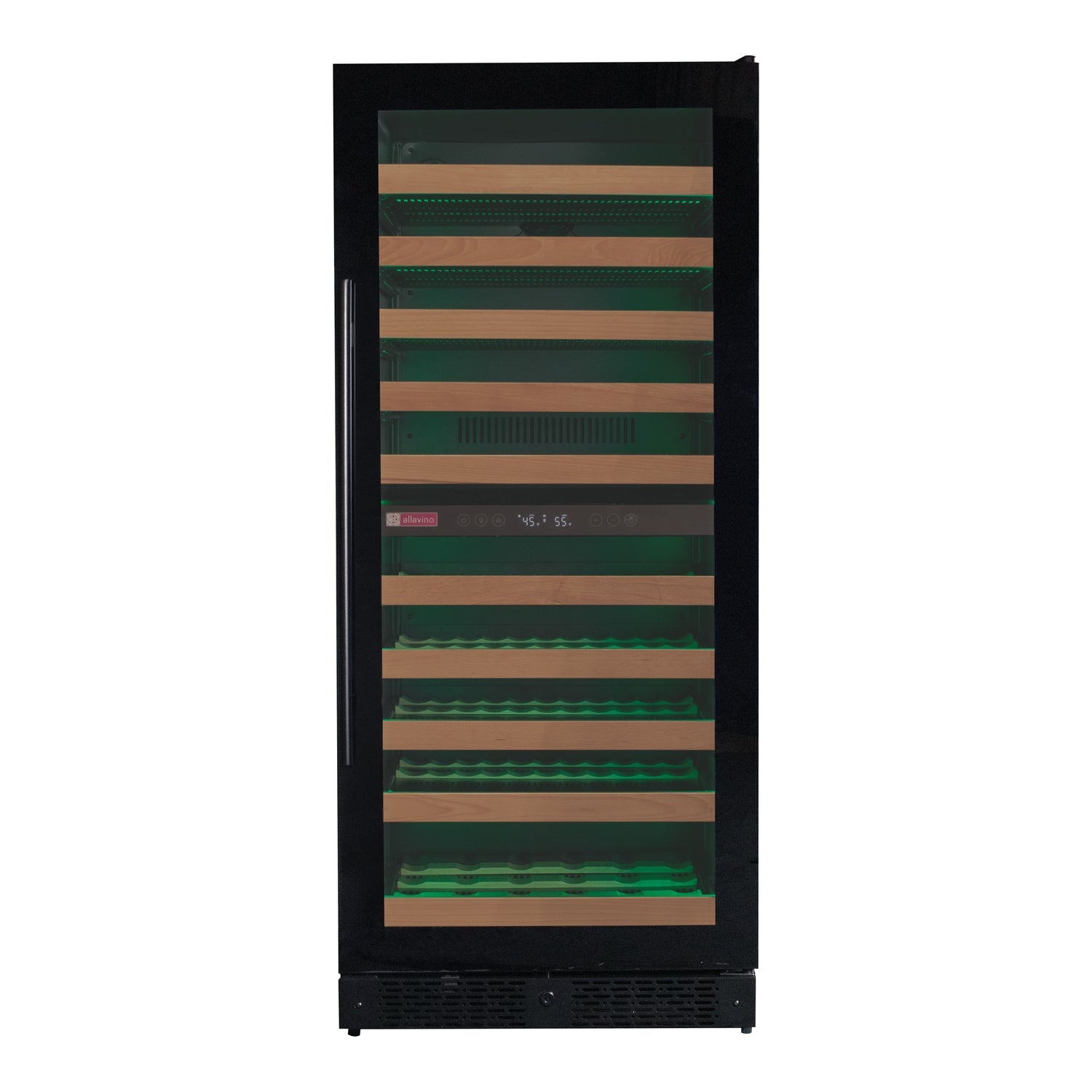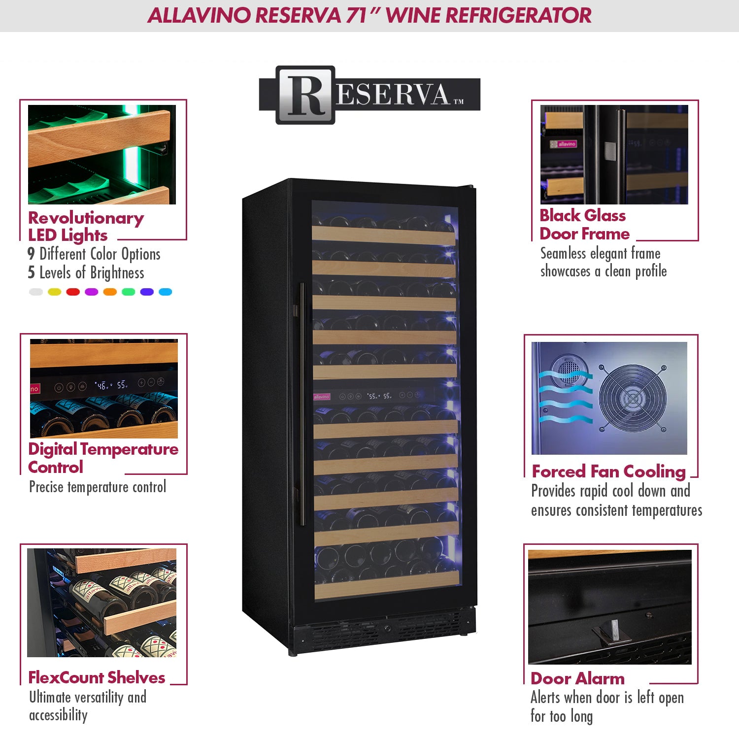 The Allavino Reserva Series VSW11955D-2BGR Dual Zone Wine Refrigerator with Tru-Vino Temperature Control Technology makes it easy to store up to 119 wine bottles of various sizes. and can be used as a stylish freestanding unit or built into your cabinetry. The seamless black glass door showcases an elegant and clean profile while also resisting visible fingerprints, and customizable LED lighting allows you to choose from 9 color options and 5 brightness levels. Unlike incandescent lighting, LED lighting does not give off heat that can damage your wine. Protect and preserve your wine collection with the latest innovation in wine storage technology by Allavino. Precisely set your desired temperature with the easy-to-use digital control panel and trust in Tru-Vino Temperature Control Technology to protect your collection through consistent temperature maintenance. Allavino's exclusive FlexCount wine racking technology cradles bottles and is designed with vibration-reduction technology to protect aging wines. This unique shelving design allows for ultimate flexibility and versatility when it comes to storing a variety of bottle sizes and shapes. Easy gliding shelves allow for easy access to your collection without disrupting the delicate wine maturation process.